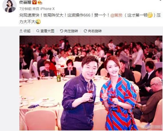剛剛看到佟麗婭曬出跟黃渤一起參加飯局的找坡,還說:兌現速度快,飯局陣仗大,這波操作666!贊一個!順便還艾特了渤哥,這才第一頓壓力大不大?